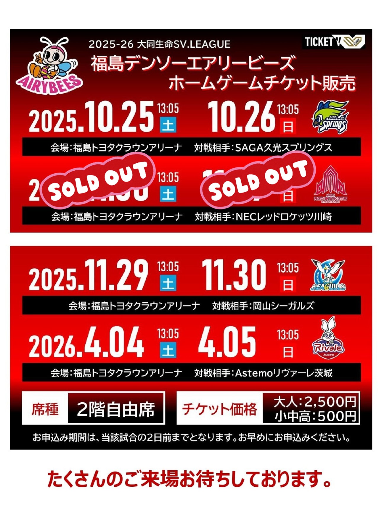 掲載日:2025年10月20日 / Last updated : 2025年11月4日 sportspc All 令和7年10月20日(月)より、大同生命SV.LEAGUE デンソーエアリービーズホームゲームのチケットを福島トヨタクラウンアリーナ事務室にて販売いたします。 詳しくは⇩をご覧ください。 ■お問い合わせ先 福島トヨタクラウンアリーナ TEL 024(539)5500 8:30~17:00まで