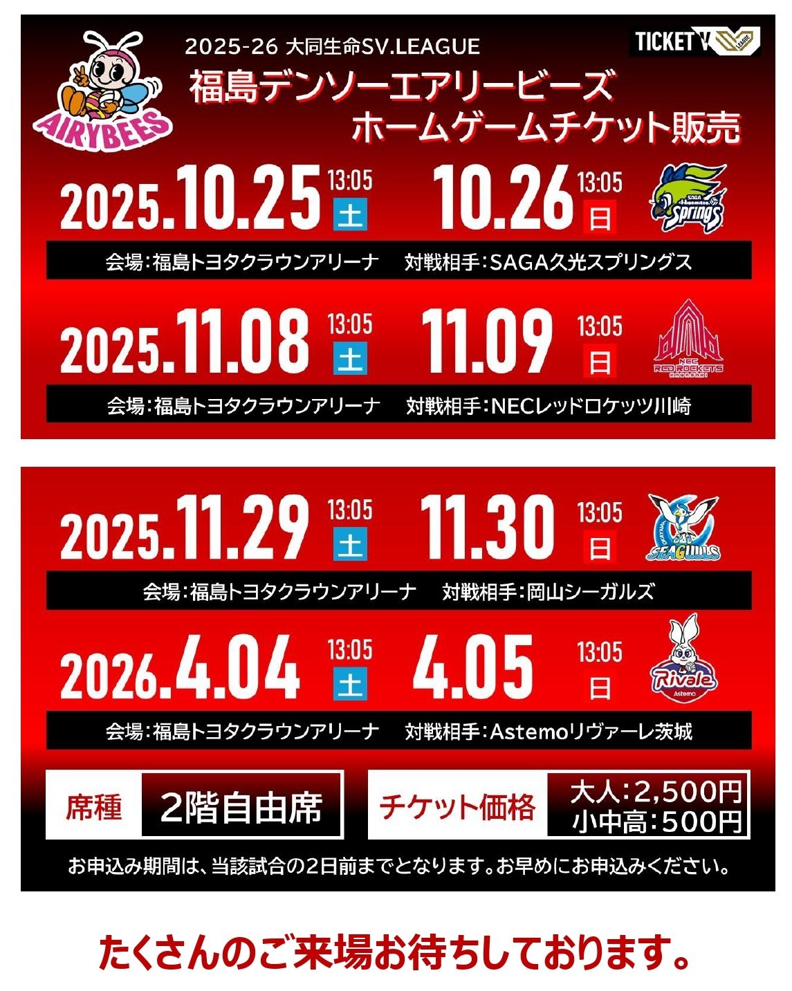 掲載日:2025年10月20日 / Last updated : 2025年10月20日 sportspc All 令和7年10月20日(月)より、大同生命SV.LEAGUE デンソーエアリービーズホームゲームのチケットを福島トヨタクラウンアリーナ事務室にて販売いたします。 詳しくは⇩をご覧ください。 ■お問い合わせ先 福島トヨタクラウンアリーナ TEL 024(539)5500 8:30~17:00まで