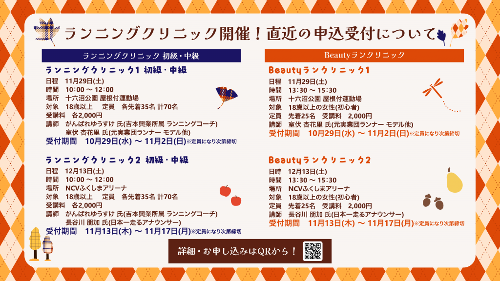 また、「ランニングクリニック1初級・中級」「ランニングクリニック2初級・中級」「Beautyランクリニック1」「Beautyランクリニック2」のお申し込みも10月下旬から開始いたしますので、ご興味のある方はこちらからお申し込みください!