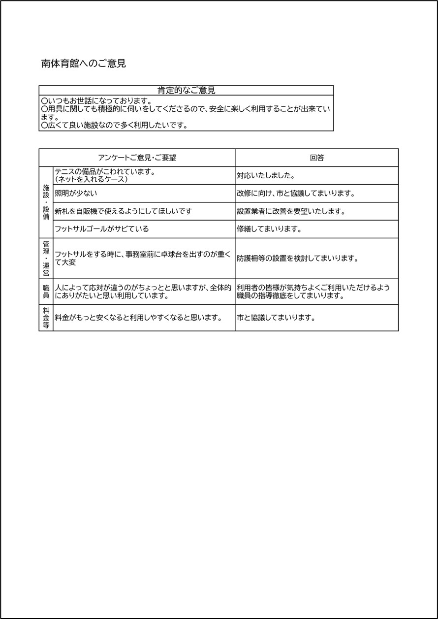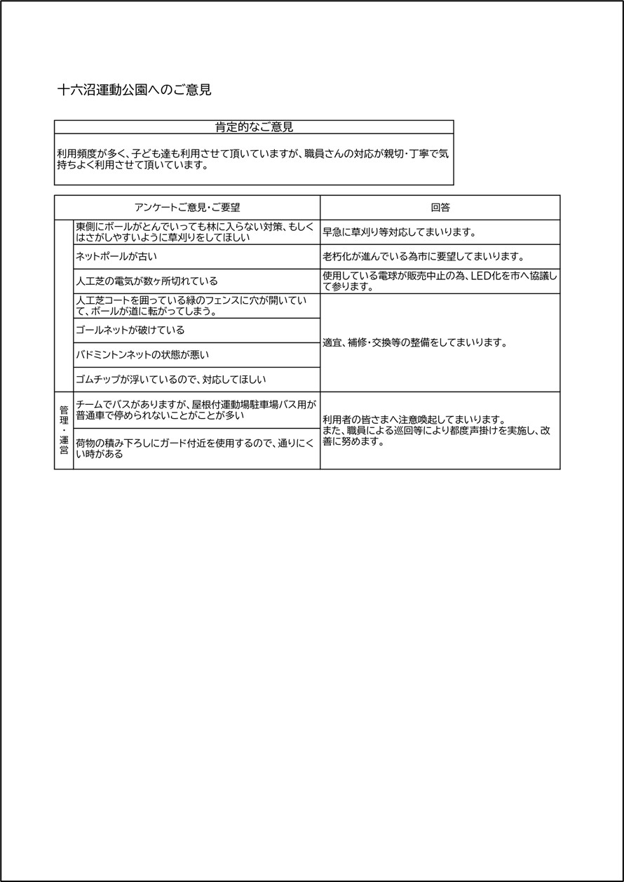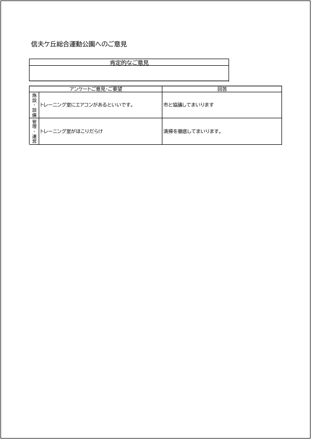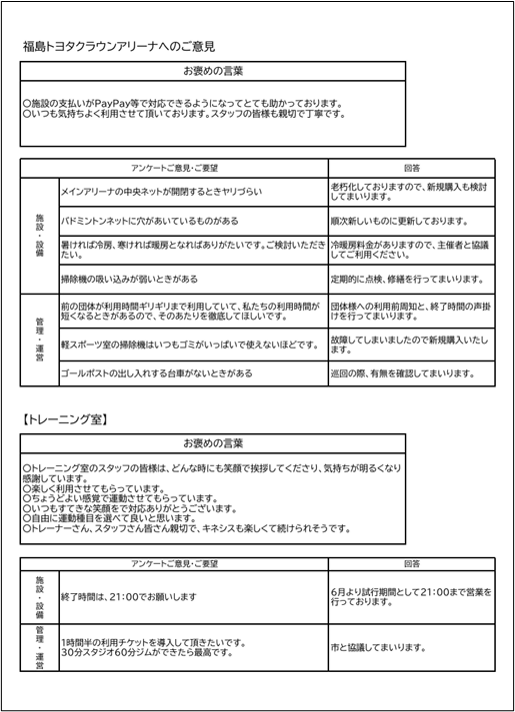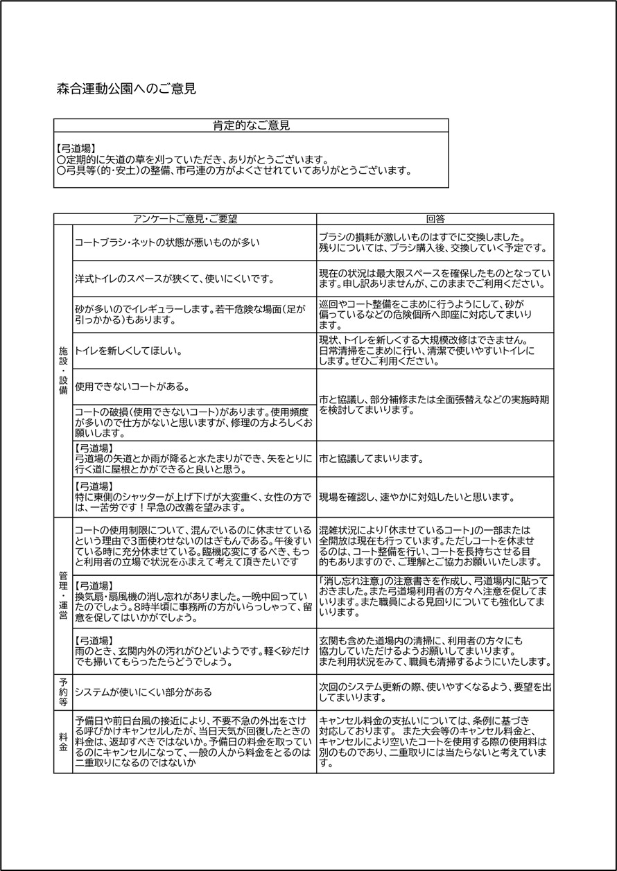 令和7年9月8日~9月30日の期間をアンケート調査強化期間として、当公社管理施設をご利用いただいている皆様にアンケート調査のご協力をいただきました。お褒めの言葉からご指摘やご要望等まで、たくさんのご意見をいただき、誠にありがとうございました。皆様からいただきましたご意見を今後の施設管理運営に反映させつつ、ますます皆様に気持ちよくご利用いただけますよう、より一層の努力をしてまいりますので、今後とも何卒よろしくお願いいたします。