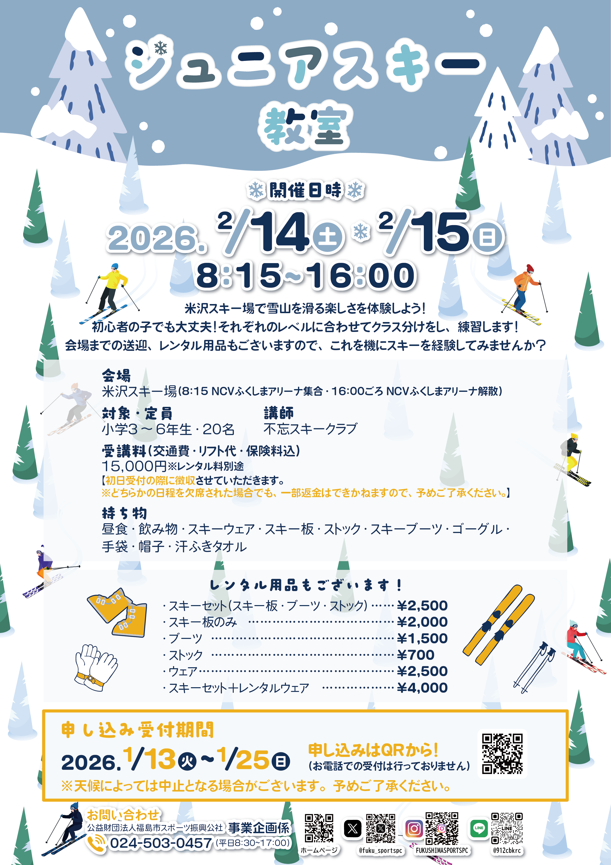 場 所:米沢スキー場(8:15 NCVふくしまアリーナ集合・16:00ごろ NCVふくしまアリーナ解散)