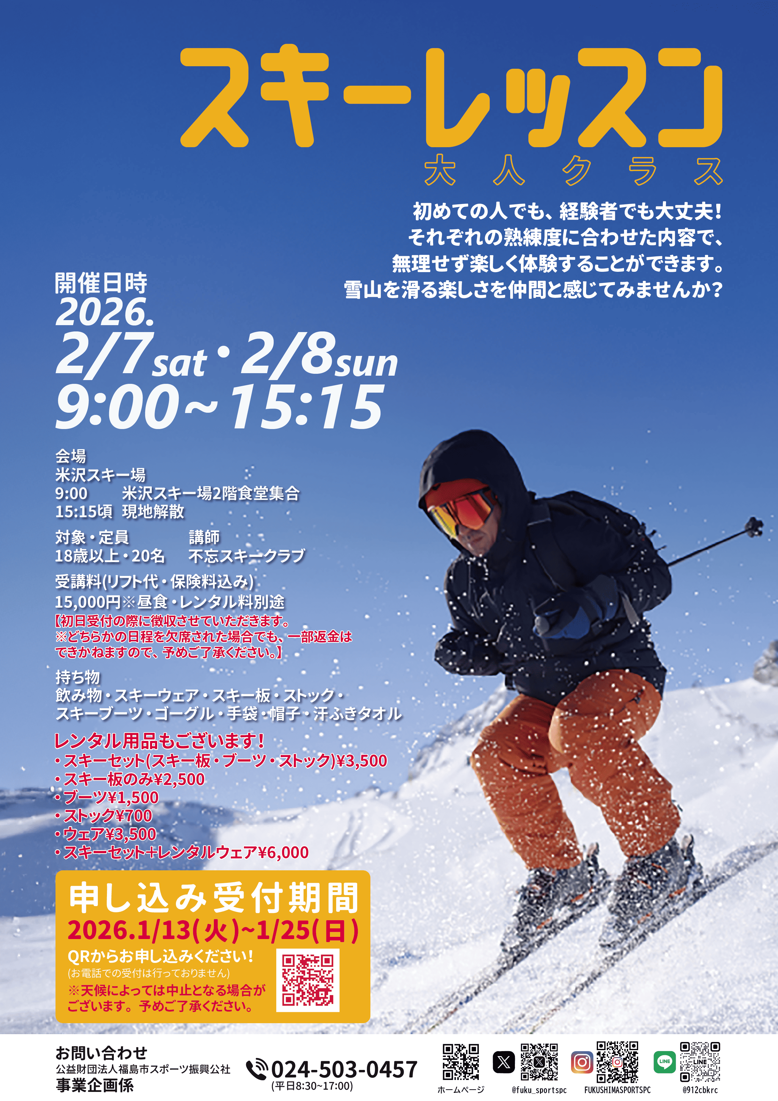 場 所:米沢スキー場(9:00 米沢スキー場2階食堂集合・15:15頃 現地解散)